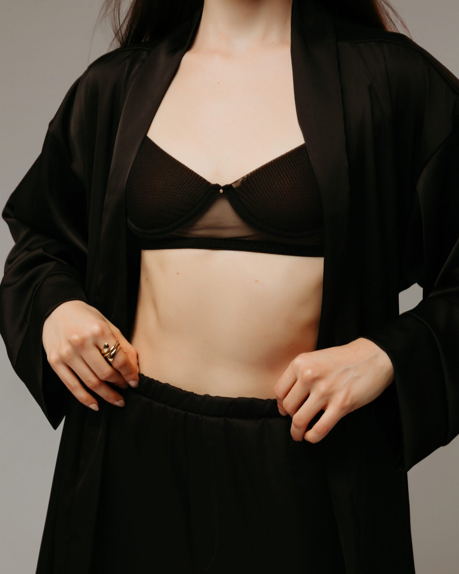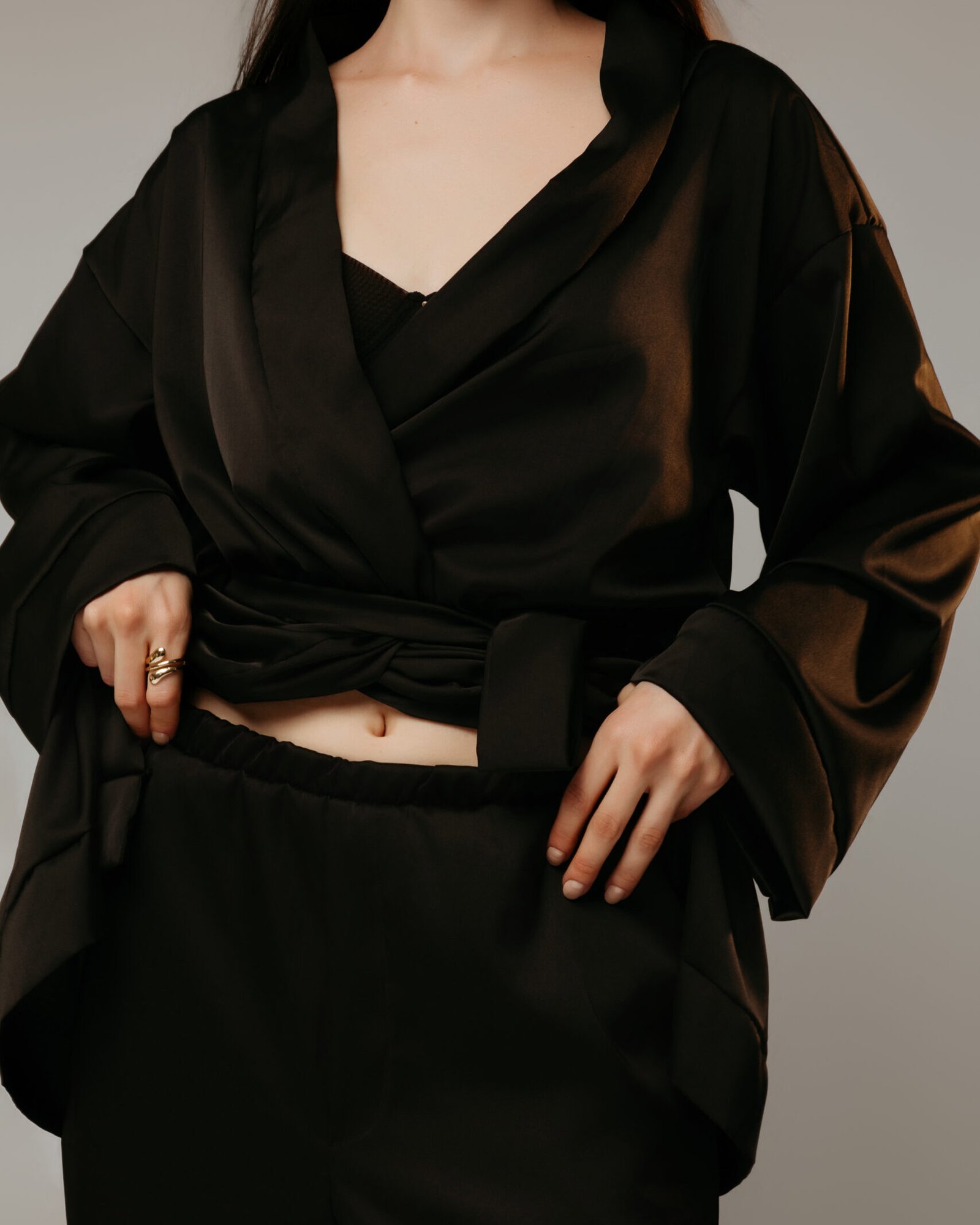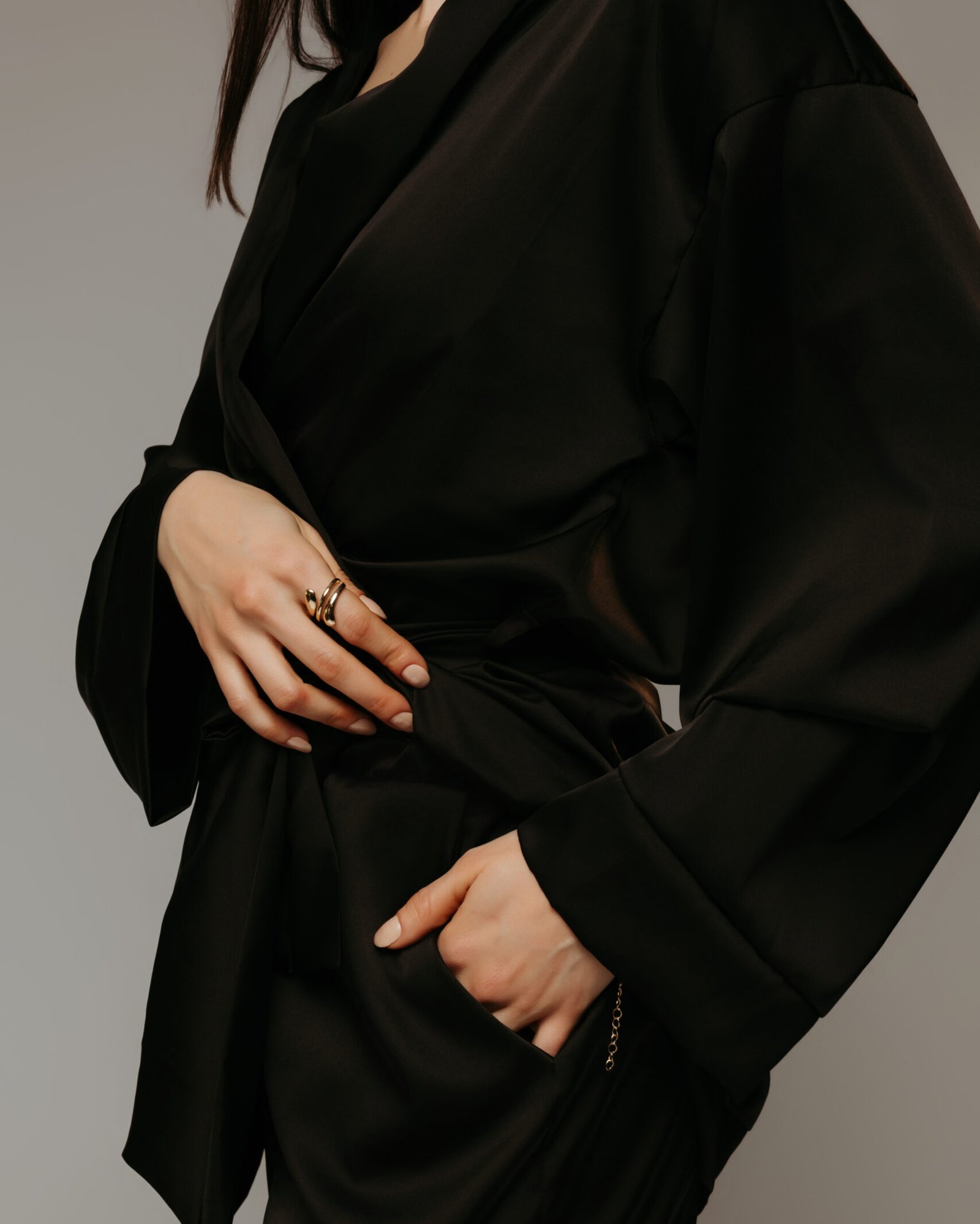ela é toda em tecido acetinado, com um caimento leve e fluído, possui elástico no cós e bolsos frontais.