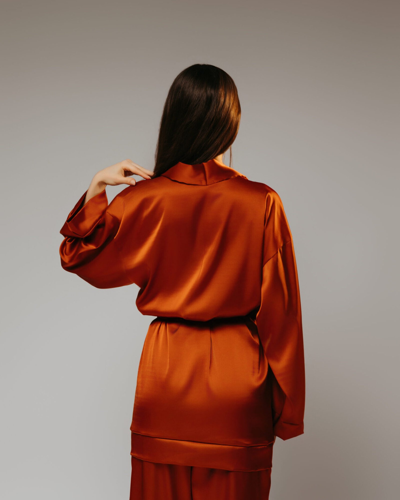 todo em tecido, com um caimento leve e fluído, um toque acetinado que traz ainda mais charme e elegância para peça, possui tira em tecido para amarrar na cintura, mas ela é removível, corte clássico e atemporal;